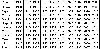 A sequência dos signos do Horóscopo Chinês, o calendário é lunar e varia.